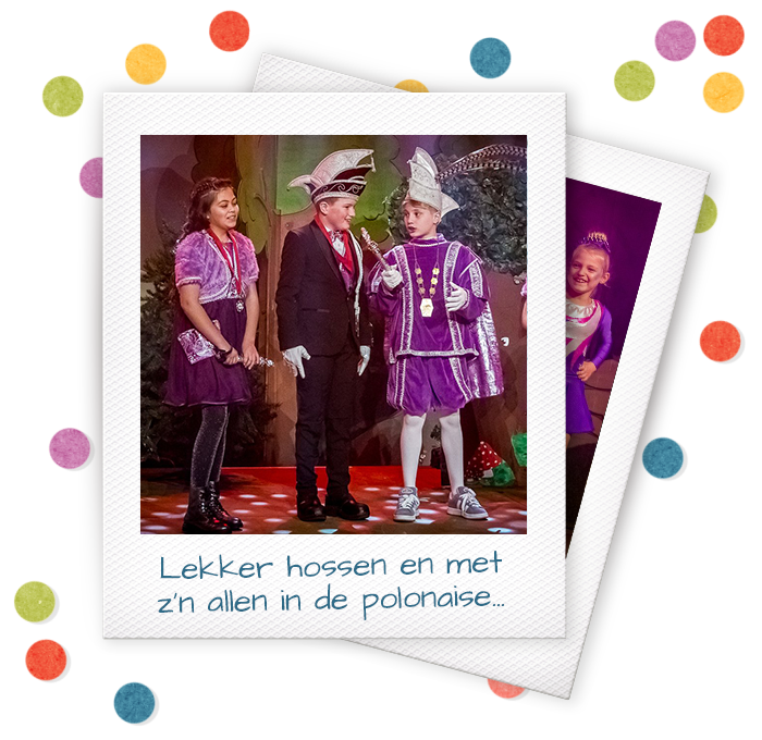 Wij beginnen de vrijdagmiddag met de installatie van piassenraad, aftreden van jeugdprins en gevolg en de onthulling van onze nieuwe jeugdprins met gevolg. Op zaterdag en zondag nemen we met onze piassenwagen deel aan de optochten in Weurt en Beuningen. De Piassen vinden dit helemaal geweldig omdat ze dan op de wagen mogen en door Weurt en Beuningen heen trekken. Op maandag en dinsdag hebben we de kindermatinees waar we hossen, springen en gezellig met zijn allen frietjes eten. Naast het hossen en springen met carnaval hebben we de flessenactie en het piassenuitje.